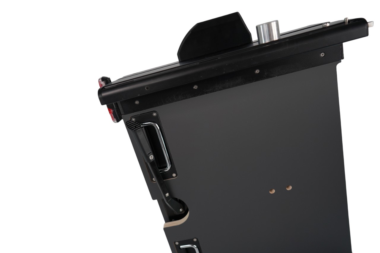 Die tiefschwarze Oberfläche wirkt ruhig und präzise – wie ein grafisches Element im urbanen Raum. Kein Dekor, keine Ablenkung. Nur Funktion, sichtbar gemacht.